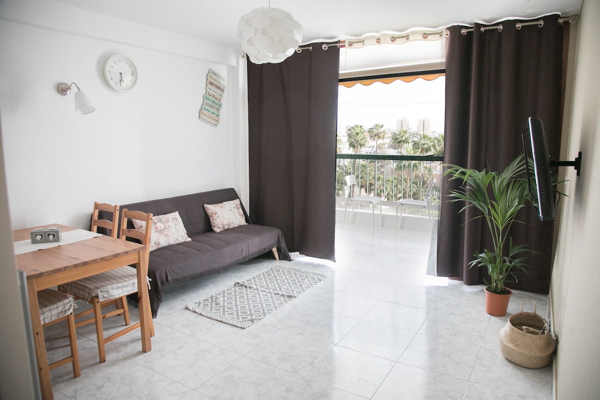 Checkout my fully equipped 1 bedroom newly renovated and comfortable apartment in the heart of Playa de las Americas (the most vivid region) in Tenerife just 1 street from the sea! Enjoy the direct ocean balcony view, a king size anatomic double bed, free Wifi up to 300Mbps, free access to the pool, free parking, new IKEA kitchen with oven and all kitchenware of highest quality, new electric appliances, sleeping sofa, laundry, LCD TV and much more!