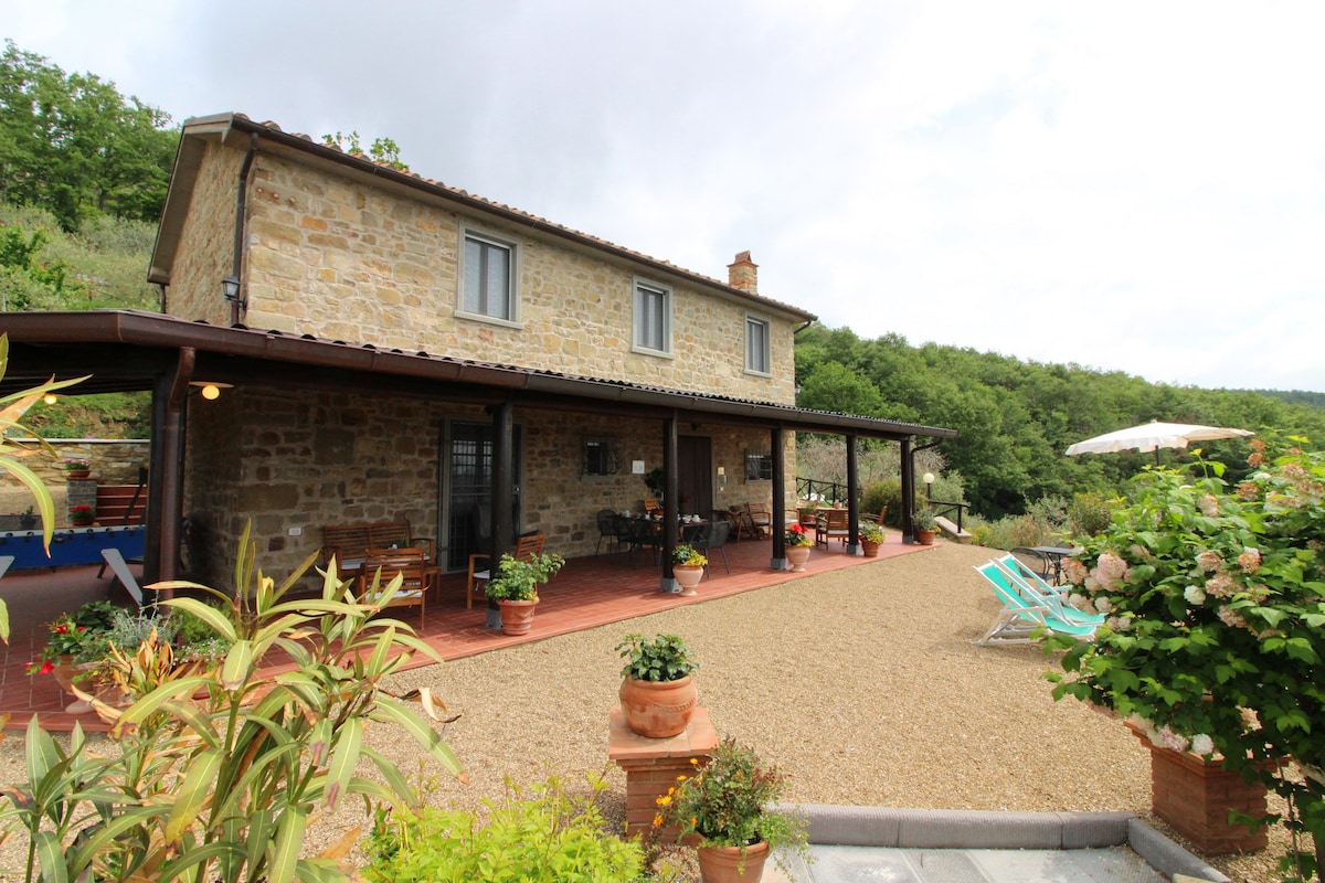 CARATTERISTICA CASA TOSCANA in pietra immersa nelle colline della provincia di Arezzo. Vicino a Siena, Firenze, Cortona, Perugia, Sansepolcro e alle Foreste Casentinesi. Ideale per trekking, turismo enogastronomico (a pochi km si trovano alcune tra le migliori cantine della Toscana), per appassionati di arte e cultura. A disposizione esclusivamente per gli ospiti un grande terrazzo panoramico, molto riservato. Vi accoglieremo con un presente di benvenuto.