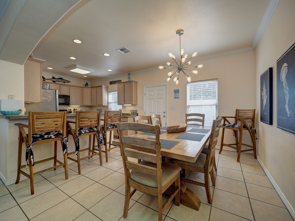 Come make memories at this unique, family-friendly oasis! This retreat promises a luxurious beach vacation! Upscale living, this is simply the finest house in Port Aransas. ~Free Golf Cart ~Very close to the beach ~Private Heated Pool ($50 per day additional cost to heat the pool) ~Fire Pit with wood and s'mores included (November to April) ~Located in the quiet part of town ~Walk to all the restaurants ~Huge outdoor TV with Sonos Soundbar ~Lawn games (Cornhole, Mini Golf) ~Keyless Entry
