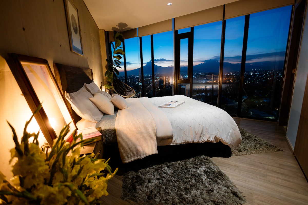 在18樓醒來,欣賞全景火山景觀;每次日出都帶來新的地平線。 這間現代化、寬敞的閣樓融合了舒適和設計,非常適合家庭或長期住宿。 最近升級了真正的床,可容納6位旅人。 設備齊全的廚房、電動百葉窗和快速Wi-Fi。24小時健身房、360度景觀屋頂、有蓋停車位和寵物友好型建築,配有私人保安和24小時保安。 連續4年獲得優秀評價的星級旅居主人。