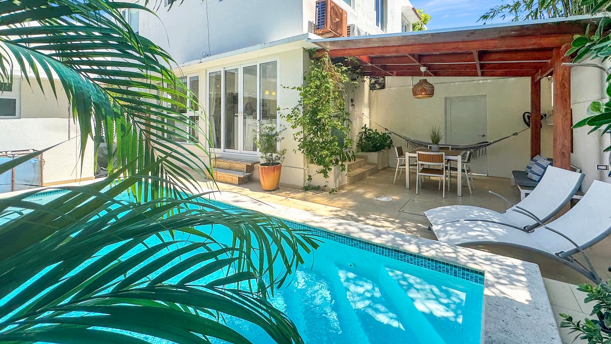 在配備高級寢具的豪華加大雙人床上醒來,眺望被茂盛棕櫚樹環繞的私人泳池。在設備齊全的廚房享用早餐,開始新的一天,然後在涼爽的涼亭下使用超快的Wi-Fi上網。在泳池中放鬆身心,或在室外熱水淋浴間沖涼,然後步行50碼即可抵達聖胡安最好的海灘。非常適合情侶、獨行旅客、遠距工作人士或追求舒適和時尚的小家庭。