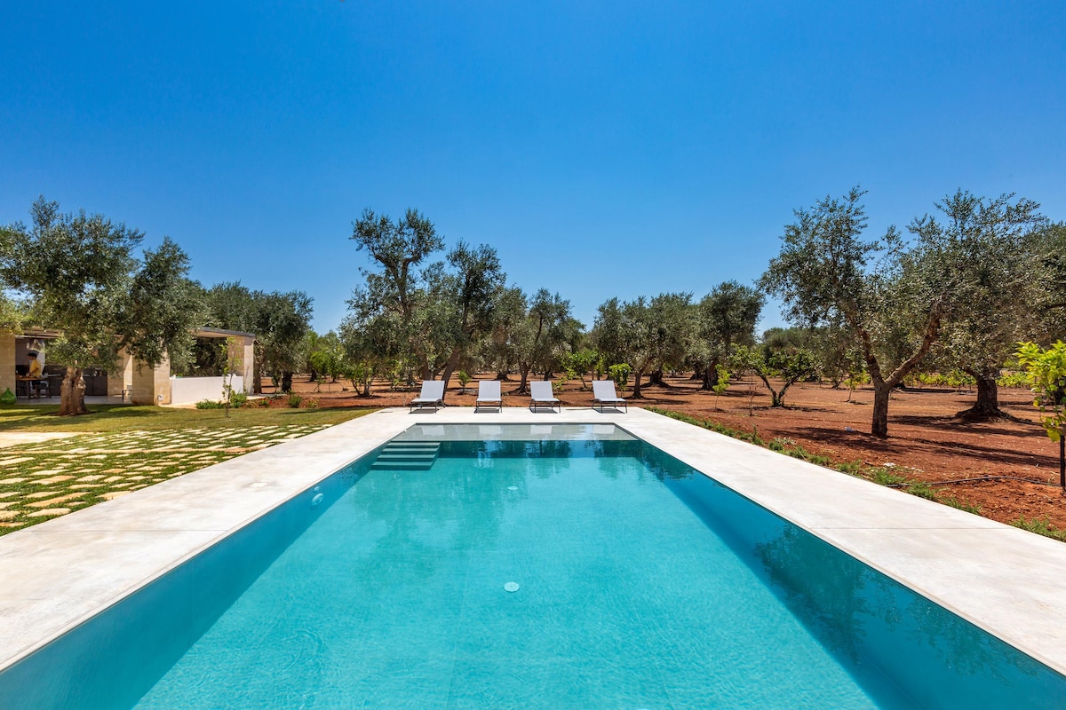 The Trullo Apulia is an exclusive property, made by recovering an original ancient historic domed house (called "Trullo Saraceno"), enriched by swimming pool, Jacuzzi and steam room for private use, in a scenic location, just 2 km from Ostuni and 10 km from the beautiful beaches of Puglia. It can accommodate up to 8 people. Note: the reservation fee does not include consumptions of electricity (0.50€/kWh), gas (5€/m3) and the tourist tax (1€/day for each person for the first 5 days) that will be calculated and paid at the end of your stay. Struttura esclusiva con piscina, idromassaggio, bagno turco, 8 posti letto, posizione panoramica, a 2 km da Ostuni e 10 km dal mare. Nota: i costi di consumi elettrici, gas e tassa di soggiorno non sono inclusi nella fee di affitto e dovranno essere calcolati e pagati alla fine del soggiorno. Italian Version Il Trullo Saraceno Apulia è una struttura esclusiva con piscina ad uso privato, in posizione collinare panoramica, a soli 2 km da Ostuni e 10 km dalle splendide spiagge pugliesi. Dispone di 2/3 Camere da letto matrimoniali, 4 bagni (di cui uno con bagno turco, vasca idromassaggio e doccia emozionale), 2 zone living (con 2 divani letto matrimoniali), 2 cucine, 2 camini e può comodamente ospitare fino a 8 posti letto. Atmosfera unica che unisce l’inconfondibile stile mediterraneo ai comfort più moderni, per un soggiorno esclusivo ed originale, all’insegna di relax, privacy e benessere naturale. La struttura è costituita da 2 unità abitative (trullo saraceno con 3 coni + lamia) totalmente indipendenti, ma comunicanti tra loro, separate da una porta con serratura. Ciascuna unità comprende una sala da pranzo con camino, TV a led satellitare e divano-letto matrimoniale, un cucinino completo di elettrodomestici (frigo-freezer, forno elettrico, lavastoviglie, lavatrice, piccoli elettrodomestici)e una camera da letto con bagno privato, completo di doccia emozionale per cromoterapia. Ideale per 2 famiglie di amici che, fatta salva la privacy, possono godere di momenti comuni di relax e divertimento, può anche essere utilizzata come unica unità abitativa, utilizzando una delle due zone living come terza camera da letto matrimoniale. Tutti gli ambienti della casa sono climatizzati e dispongono di connessione internet WiFi. Gli ospiti hanno a disposizione un parcheggio privato. L’intera struttura ha una capacità ricettiva massima di 8 posti letto, mettendo a disposizione dei suoi ospiti ben 4 bagni, di cui 2 interni completi, un’area benessere con bagno turco, aromaterapia, ampia vasca idromassaggio (che si affaccia su una suggestiva parete rocciosa), doccia emozionale con cromoterapia e servizi igienici ed 1 bagno esterno (water+lavandino) con doccia. L’esclusiva piscina a sfioro di acqua salata con idromassaggio è immersa nel verde della macchia mediterranea. Questa oasi di privacy e di relax dispone di tutto il necessario, inclusa una Zona solarium, la doccia esterna ed il bagno di pertinenza. La profondità dell’acqua della piscina risponde ai requisiti di legge per garantire la massima sicurezza anche dei più piccoli. Molteplici sono gli spazi esterni arredati e le ambientazioni minimal chic che consentono agli ospiti di pranzare o cenare su un ampia terrazza panoramica ombreggiata da un gazebo cannucciato o di gustare, appena svegli, una ricca prima colazione all’aperto, in un’area attrezzata proprio davanti alla portafinestra della propria camera da letto, respirando i profumi dei campi, nell’intimità della luce del primo mattino. Al tramonto, l’unicità del trullo e del giardino circostante, vengono ancor più esaltati dall’illuminazione serale, che vi regalerà nuove emozioni ed un fascino indimenticabile, rallegrati dai sapori inconfondibili dei cibi grigliati al barbecue. Il complesso abitativo è frutto di una recentissima ristrutturazione di costruzioni dal valore storico (il Trullo Saraceno dalla caratteristica cupola bianca è ancora più antico del trullo a cono), in cui il sapiente recupero dei materiali, delle tecniche e dei canoni tipici dell’architettura e della storia pugliese, hanno consentito un restauro di interni ed esterni che mantenesse una linea fortemente evocativa e rispettosa dei luoghi, anche nell’arredamento dai colori chiari e naturali, studiati con la massima attenzione ai dettagli e costituito da pezzi unici e originali. Il fascino della location non conosce paragoni: la costruzione si affaccia su un giardino terrazzato caratterizzato dai tipici muretti a secco, oltre i quali si apre, a perdita d’occhio, su un’area di circa 6.000 mq di pertinenza esclusiva della casa, una valle di magnifici ulivi secolari su terra rossa. Un agrumeto, un frutteto, ampie aree di macchia mediterranea tra le quali trovano spazio molte piante ed erbe aromatiche, dischiudono immagini, in un tripudio di colori e profumi di natura incontaminata che illuminano gli occhi ed allietano la mente. l frutti e gli ortaggi tipici pugliesi, totalmente biologici, sono a disposizione degli ospiti. NOTA: Trullo Apulia promuove un uso sostenibile dell'energia elettrica e dell'acqua (presenti pannelli fotovoltaici e per riscaldare l'acqua sanitaria) e ci piacerebbe che anche i nostri ospiti facessero lo stesso. Per questo motivo non includiamo i consumi elettrici in maniera forfettaria nelle spese di affitto ma saranno conteggiati secondo il consumo effettivo che verificheremo insieme, confidando in un vostro uso responsabile (per il dettaglio, vedi la sezione "Altre cose da considerare"). English Version The Trullo Saraceno Apulia is an exclusive property with swimming pool for private use, in a scenic hillside location, just 2 km from Ostuni and 10 km from the beautiful beaches of Puglia. It has 2/3 Double bedrooms, 4 bathrooms (one with a steam room, whirlpool bath and emotional shower), 2 living areas (with 2 sofas bed for 4 people), 2 kitchens, 2 fireplaces. The whole structure can comfortably accommodate up to 8