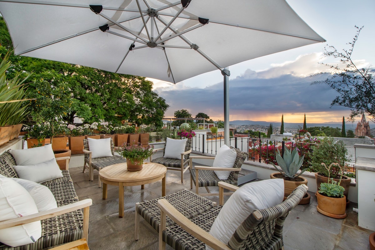 景觀和位置都很壯觀。直接位於華雷斯公園(Parque Juarez)上方,從Mirador瞭望台下來。 距離主廣場只有幾個街區。我們的房源位於另一個房源的後面和上方,讓您可以享受寧靜和私密的環境,同時欣賞聖米格爾市中心、教堂和遠處鄉村的壯麗全景。 這個物業的四層樓,可以清楚地定義空間,但又彼此連接,創造出一種寬敞的感覺,同時受益於周圍樹木和覆蓋著藤蔓的牆壁的茂密綠化。多個露臺和噴泉為乾淨明亮的室內裝潢奠定了放鬆的基調,讓人想起地中海。 主樓層有客廳、餐廳和設備齊全的廚房,配有全屋淨水系統,以及陽臺和帶套房浴室的客房。下方有一個私人花園,有一個工作室,為藝術創作提供完美的氛圍。 主臥室位於樓上,令人驚豔,寬敞開放。位於中央的加大雙人床面向景觀、法式門和陽臺。 套房浴室設有大淋浴間和天窗。 臥室外有一間套房辦公室,提供整套房源的網路和WiFi ,可俯瞰聖米格爾德阿連德第二歷史悠久的十七世紀聖十字教堂。 在主臥室正上方,您可以從日光露臺或舒適的大陰涼露臺欣賞聖米格爾最令人驚嘆的景色。 在屋頂酒吧放鬆身心,欣賞日落美景,享用日落雞尾酒或咖啡。 我會在您抵達前與您一起處理所有細節。 一旦抵達聖米格爾,我們的房屋經理Jose就在城裡,隨時可以提供服務。 我們的管家Esmeralda每週會在星期二、星期四和星期六來3次,通常在上午9點左右。