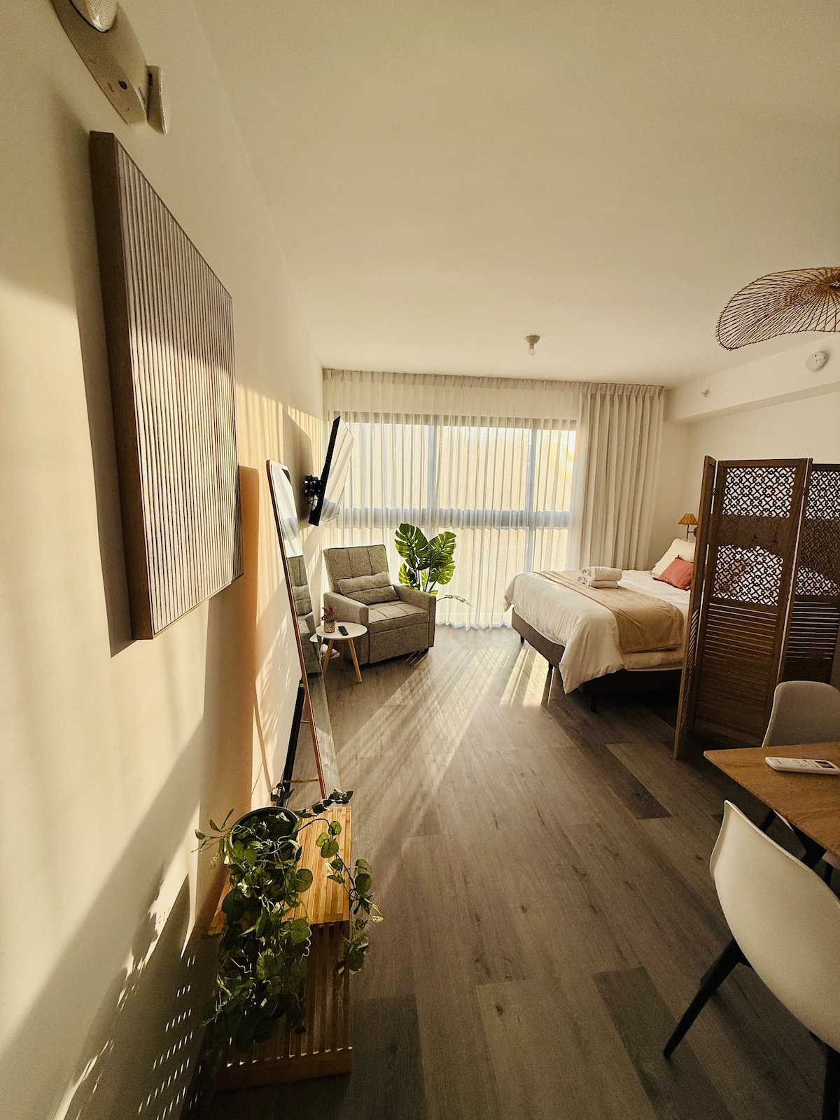 Te ofrecemos un aparta en un piso 18, con vista panorámica y brisa fresca. Este loft moderno combina estilo y comodidad con un balcón integrado, cortinas blackout para mayor confort, wifi y parqueo privado. En el piso 25 contamos con una piscina infinita, área de iworking y más. Estamos ubicados en una zona segura y céntrica de Curridabat, donde tendrás todo a tu alcance. Como Súper Anfitrión Top 10% en Costa Rica, garantizo atención rápida y dedicada para que tu estadía sea inolvidable.