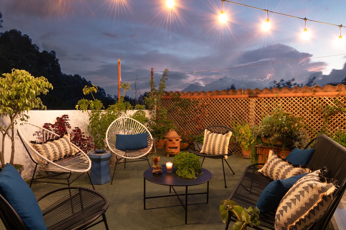 Casa Colmena是一間2間臥室、2間浴室的房源,步行15分鐘即可抵達Parque Central。 這裡還有一個美麗的屋頂露臺,可欣賞三座火山的美景。 Starlink WiFi截至2024年4月。 房子外面有街邊停車位,附近可以安排更安全的停車位,但需支付額外費用。