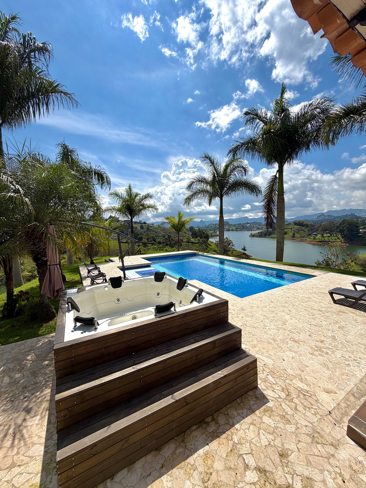 Estaran rodeados de una vista espectacular a la represa de Guatapé y la imponente Piedra del Peñol.Nuestra piscina y jacuzzi perfectos para relajarte creando un ambiente mágico para compartir al aire libre con un buen asado en nuestra zona BBQ y crear recuerdos inolvidables. Via 80% pavimentada y 20% destapada Nota: El Agua del jacuzzi es de agua NATURAL solo en ocasiones puede llegar algo turbia mas la entregamos recien cambiada y limpia
