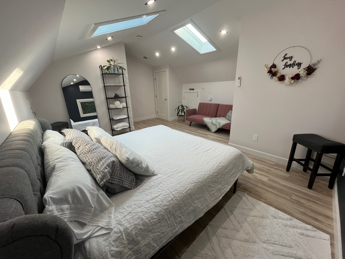 Stride across lovingly restored softwood floors that tie main level rooms together. A thorough remodeling has produced a modern kitchen and wide open, airy spaces with neutral decor. Climb stairs at night to a quiet and romantic bedroom loft. Guests have private access to the top 2 floors of the house. The 2nd floor welcomes you with a brand new kitchen, large bedroom with queen size bed, living room with queen size sofa bed, bathroom and dining room. Enjoy your breakfast (or a glass of wine) on the balcony in the summer. Take the stairs to the third floor, where you will find a private giant master bedroom loft, complete with king size bed and 2 skylights for gazing at the starry sky. Lots of room for your cars! Upon arrival, rest assured that there will always be room for up to 3 cars in the driveway (along with free street parking). Brand new kitchen is fully stocked and includes a washer/dryer for your use. Large bathroom with bathtub. Dining room with table for 6. Living room with large Smart TV with cable and sofa bed with queen size pull out. Stairs lead to the private (with door) master bedroom loft. Comfy king size bed, 2 skylights and lots of books The house is on a friendly street in the town of Picton, Prince Edward County. It was purchased on a whim by a couple who fell in love with the area. Walk downtown to fine restaurants and shops. Sandbanks Provincial Park is a 15-minute drive away. Because the house is on the top 2 floors - it is important that you and your guests (including children) are OK with stairs. We do not have baby gates. Home access is keyless via smart lock.