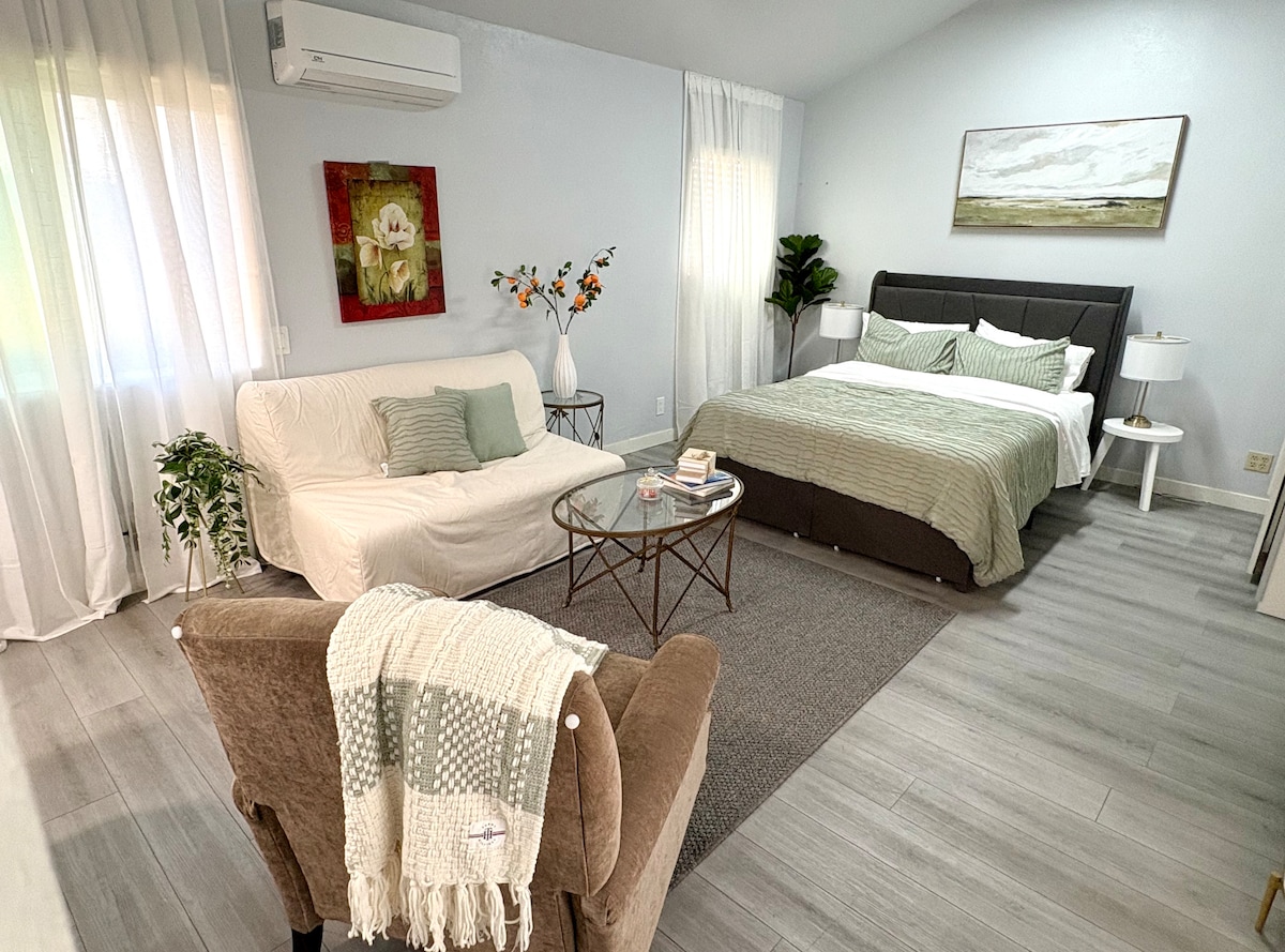 歡迎來到新改造的加州套房!享受歷史悠久的聖地牙哥公園街區,靠近迪士尼樂園、天使體育場、紐波特和亨廷頓海灘、南海岸廣場、CHOC、Main Place Mall、The Orange Circle、Irvine Spectrum等。這是一個全新的500平方英尺大型單間公寓。有很多免費停車位、美麗的戶外區域可供閱讀和放鬆、大電視、空調、暖氣、洗衣房、全套浴室和配備Keurig的全新廚房!來放鬆身心,享受美好時光!