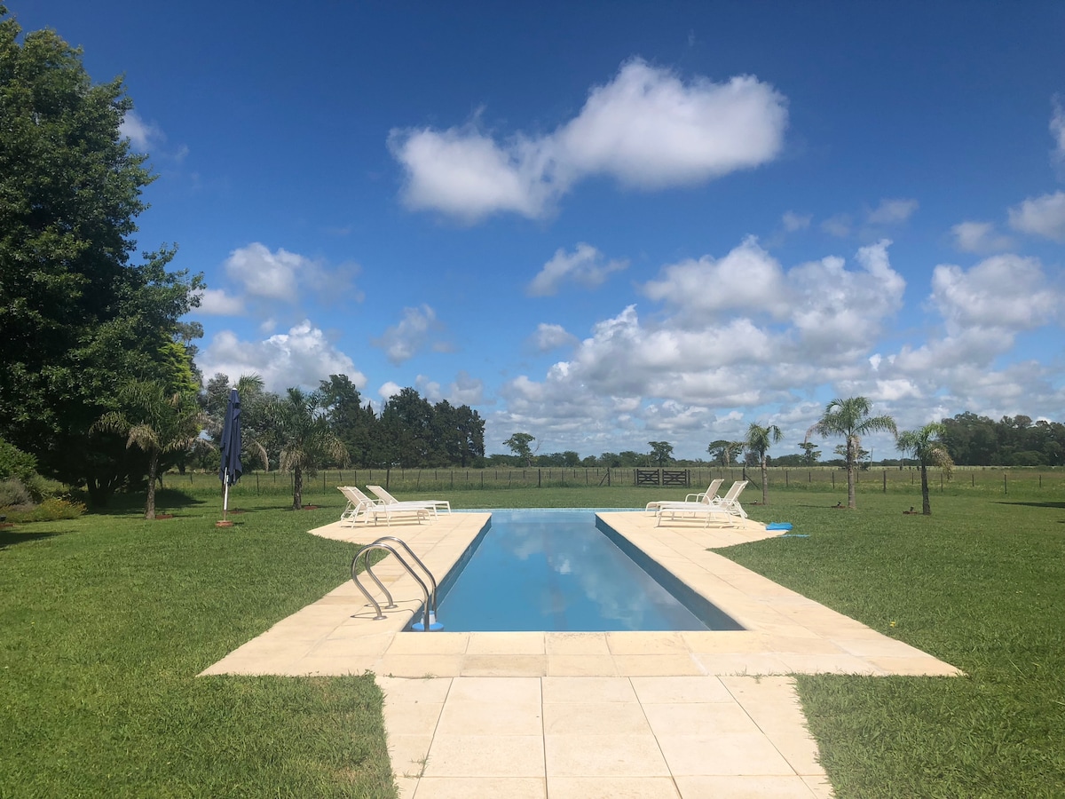 Homie ,放鬆舒適的農場住宿,距離布宜諾斯艾利斯50分鐘。 非常適合在大自然附近度過週末,欣賞美麗的日落和觀星。 牧場非常適合想要遠離塵囂的情侶和小家庭,或想在大自然氛圍中體驗阿根廷的遊客。 設施包括:閃爍泳池、24小時現場工作人員、WiFi、壁爐、燒烤「quincho」、網球場、bocha ,非常適合私密聚會和慶祝活動、馬匹等!
