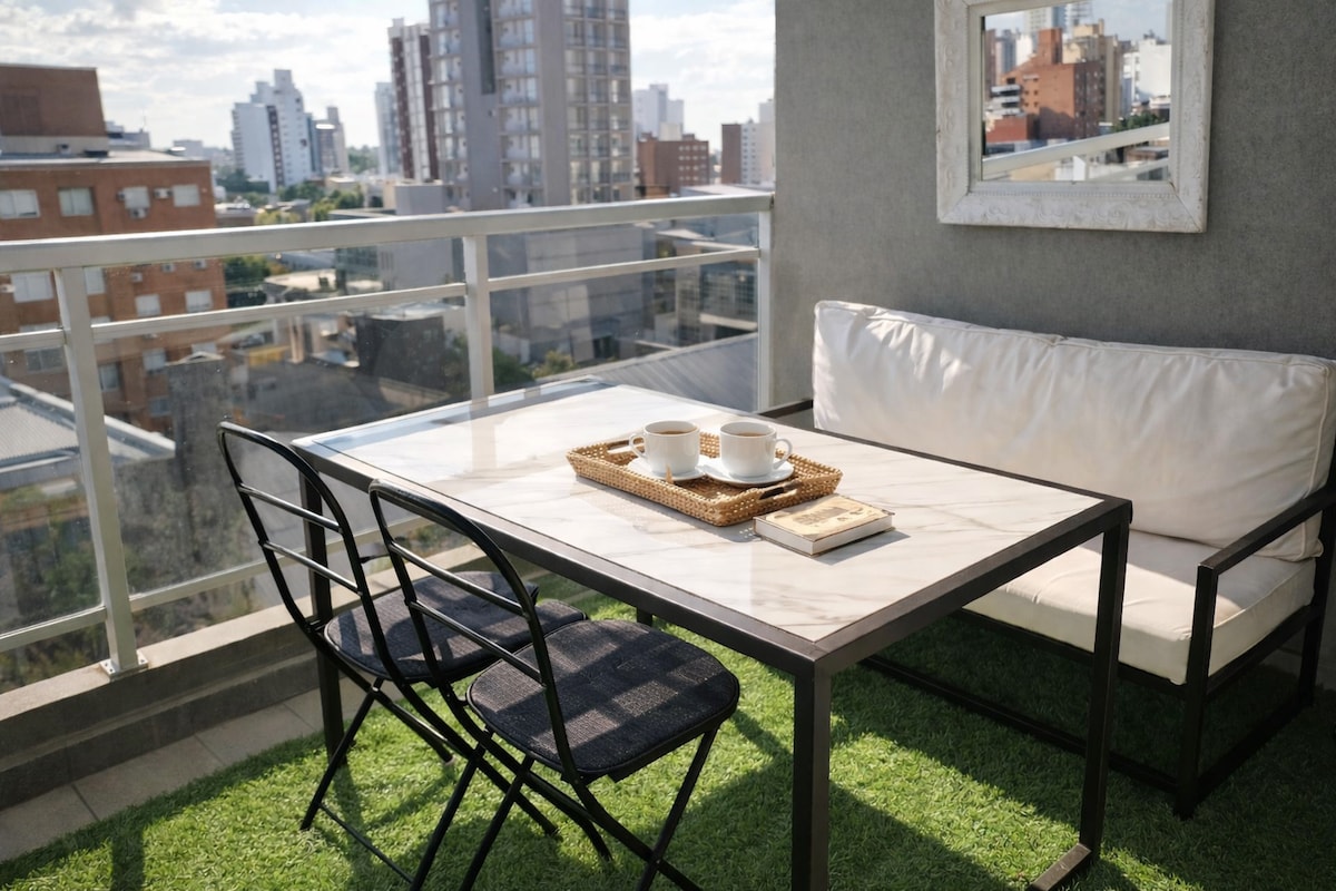 位於羅薩裏奧市中心的HOWO大樓內的全新現代單間公寓。 距離科爾多瓦步行區200公尺,距離國旗紀念碑500公尺,距離西班牙公園和巴拉納河700公尺。 紐約風格的工業設計,地板以藝術家的作品和獨特的金屬細節為特色。 包括設備齊全的廚房、全套衛浴和陽臺。 非常適合在市中心學習或工作的人,也適合尋找風格和舒適的情侶或遊客。