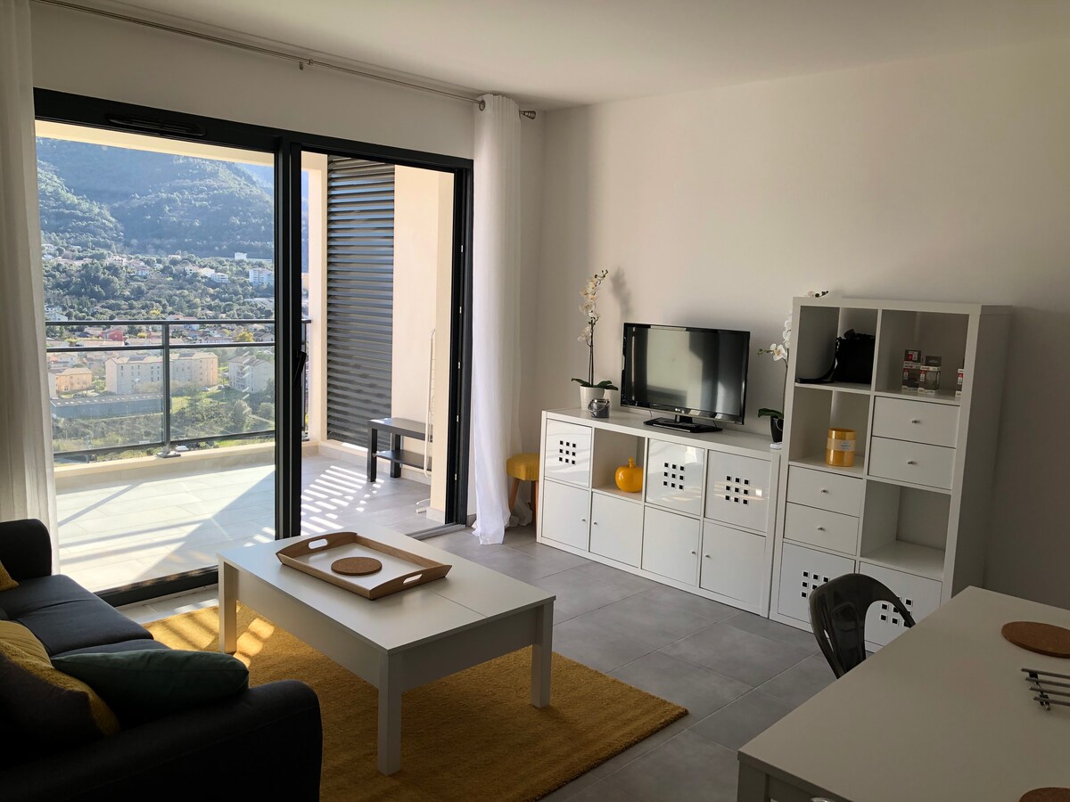 一室公寓,全新翻修,設備齊全,位於安靜的住宅區。 明亮的住宿,地理位置優越。 二樓,我的主要住所的樓層門。附近有免費停車位(100 公尺)。 您可以享受附近的所有商店和休閒設施: 步行 10 分鐘即可抵達舊城區(科西嘉博物館、堡壘)、火車站。 開車 30 分鐘即可抵達雷斯托尼卡山谷 (Vallée de la Restonica) 的各種徒步路線。 開車 30 分鐘即可抵達海灘。 房東熱愛大自然和山脈,可為您提供所有可能的徒步旅行建議(雷斯托尼卡谷和塔維尼亞努谷、GR20 等) T1 型住宿面積約 30 平方公尺,設有露臺,可俯瞰山景。公寓設備齊全(可逆空調、雙人床臥室、雙層玻璃窗、電視、WiFi、設備齊全的廚房等)。 住宿位於安靜、迷人的區域,靠近所有便利設施