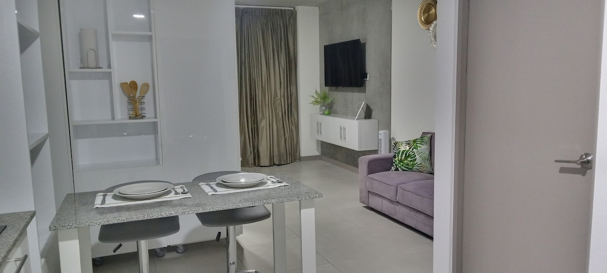 Stylish apartment in the nicest neighborhood of San Jose. The loft is in a new luxury tower with more than 10 amenities (co-work spaces, semi-olympic pool, therapeutic pool, Jacuzzi on different floors, children's garden, two gyms, and several other spaces). Supermarkets, banks, restaurants, Sabana Metropolitan Park, National Stadium, are all located nearby. Great for medical tourism, business travelers, or anyone who wants to visit San Jose.