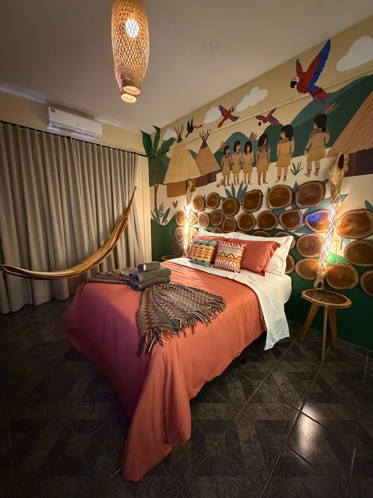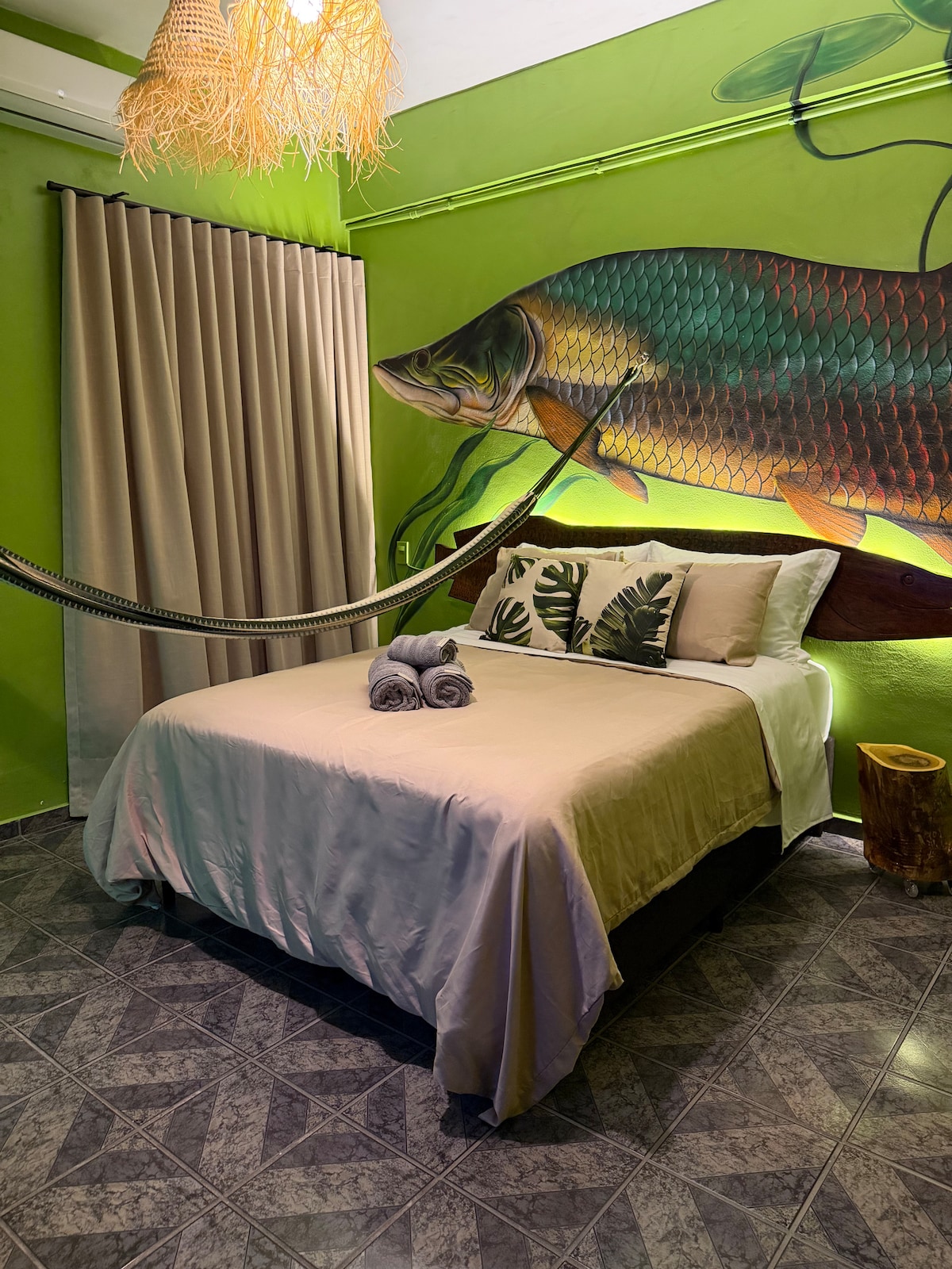 Amazonian Suite Pirarucu theme, scenic lighting and regional identity in the heart of the city. Queen bed with premium boutique linens and an exclusive atmosphere with private bathroom Great location, close to everything Enjoy your stay with: • Smart TV • Wi-Fi • Workspace • Minibar • Coffee maker • Electric kettle Shared area with: • Self-service mini market • Washer-dryer -additional fee • Free Ice • Balcony Perfect for those seeking premium comfort with an authentic Amazonian experience