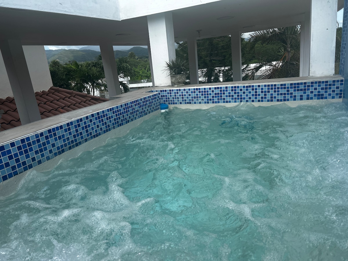 jacuzzi -Piscuzzi .para 8 personas En caso de que quieras usarlo, deberás preguntar para prepararlo. Cuenta con 5 habitaciones todas con aires acondicionadas ,7 camas ,tres son tamaño king 4 queen .2 baños.Entradas independientes con garage para dos o tres vehículos .vista panorámica a las montañas. Todos los espacios súper amplios y acogedor. Se presta para pareja ,grupos grande o eventos ,tenemos otras 8 propiedades con Jacuzzi privado y vista panorámica .