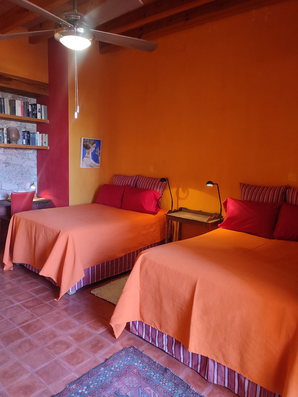 La Habitación #5 es la más espaciosa y silenciosa de la Posada — una suite presidencial llena de luz y confort. Cuenta con cama King Size, baño completo privado, sofá de tres plazas, área de trabajo y ropero amplio. Su atmósfera tranquila y elegante la hace perfecta para quienes buscan una estancia especial y relajada en el corazón de Querétaro.