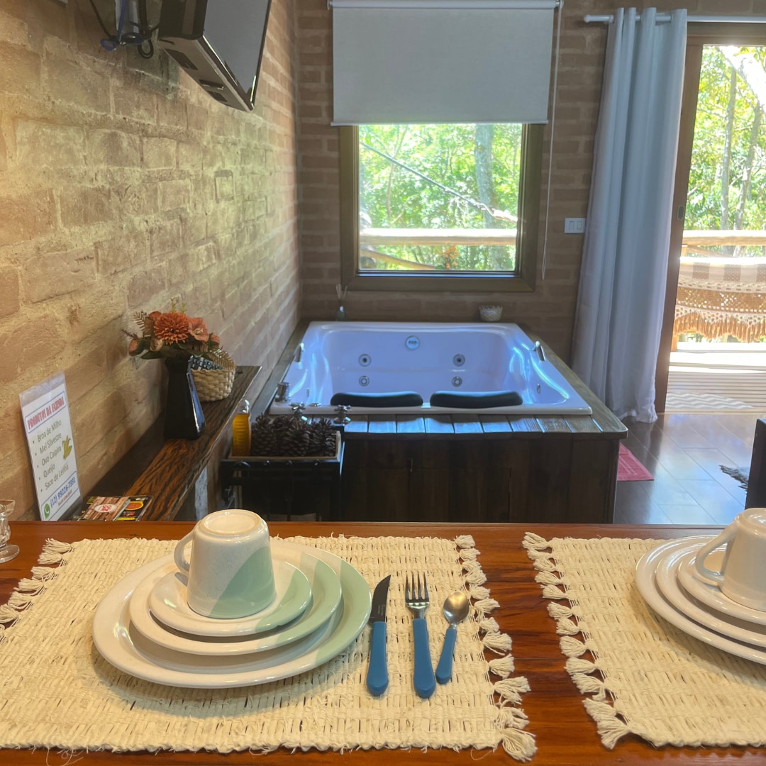 迷人且寬敞的小屋,有花園和草坪,可接待您的寵物。預訂時請將您的寵物包括在內。 套房配有全套廚房、陽臺和全景按摩浴缸。區域周圍有停車位。 歡迎攜帶寵物入住,但請記得確認,以便我們為小屋做好準備。 周圍被森林包圍,距離 Sto Antônio do Pinhal 中心 1,800 公尺,有柏油路。