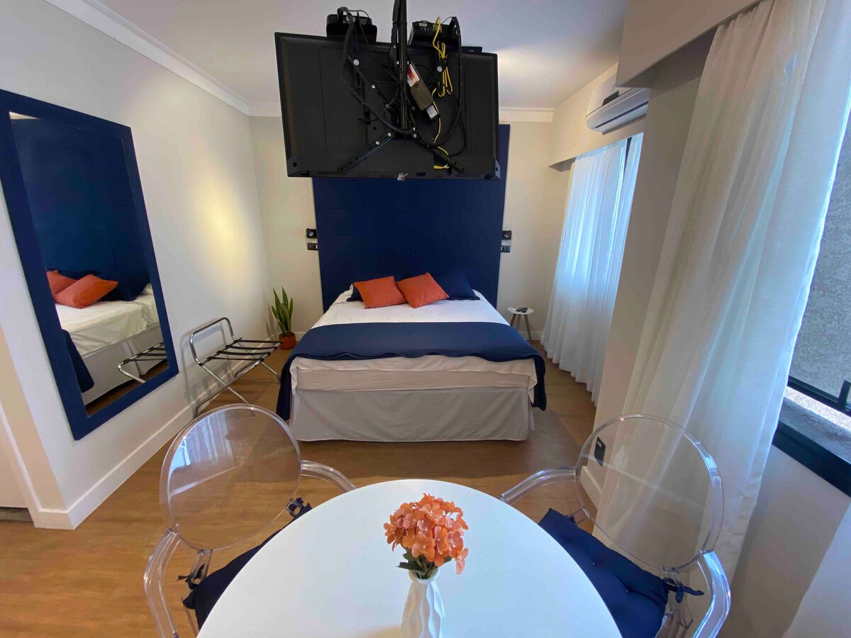 舒適的公寓,景觀壯觀,距離大道2個街區。 Paulista在飯店提供女傭服務、24小時接待處、健身房、遊泳池、桑拿房、高速WiFi。 Mobiliado ,廚房配有基本餐具,電磁爐,微波爐,迷你吧, 50英寸智慧電視。 地理位置優越,距離Trianon Masp地鐵站500公尺,靠近FGV ,有地標、餐廳和醫院。 *餐廳、洗衣店、客房服務單獨支付。 *入住時間為下午3點/退房至上午11點