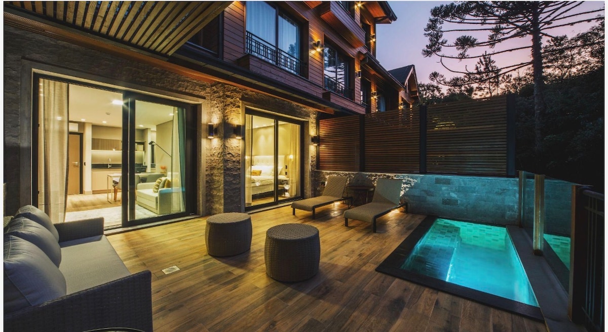 Desfrute de dias inesquecíveis em uma Suíte Deluxe com deck privativo, localizada no melhor hotel 6 estrelas de Gramado, perfeita para quem busca conforto, exclusividade e uma experiência completa na Serra Gaúcha..