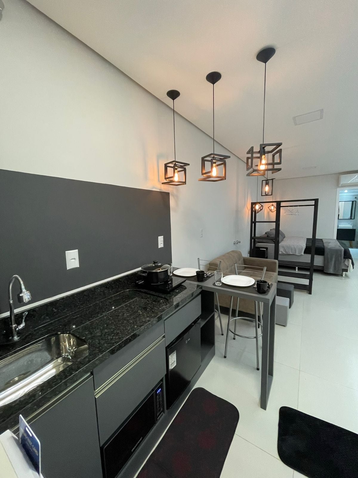 位於Praia Grande/SC市中心的全Loft (臥室、客廳、廚房、浴室和水療浴) ,非常適合情侶入住! 按摩浴池、火坑、空調、WiFi、Netflix、停車位和數位鎖自助入住。 Aconchegante ,浪漫而實用—非常適合體驗兩人的特別時刻。 🛁🔥💑