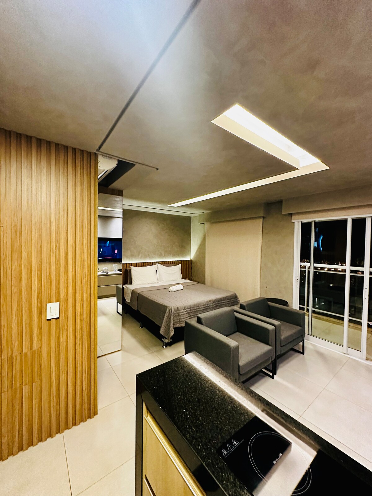 Flat in the Square Faria Lima complex (Comfort Suites) with city views, kitchenette and king bed + sofa bed for up to 3 guests. The building offers a rooftop pool, hot tub, gym, game room and restaurant. 24h front desk. 📍 600m from Hospital de Base, 400m from Beneficência Portuguesa Hospital, 800m from Plaza Avenida Shopping and 1.3km from Riopreto Shopping. 🏆 Top 10% of homes — 4.93 ⭐. Apt 814, 8th floor.