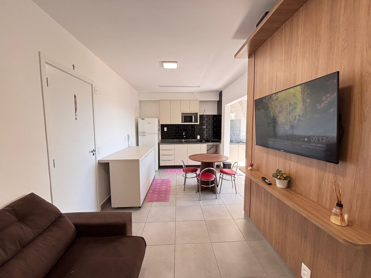 O Flat localiza-se no Summit Flat Service com recepção bilingue 24hrs, estacionamento gratuito, piscina, academia e limpeza diária. Recém reformado com decoração clean e aconchegante possui uma mini cozinha completa com frigobar, cooktop, microondas, cafeteira elétrica, e todos utensílios de cozinha. Próximo ao shopping Center Vale (2 quadras) O prédio possui uma mini conveniência para necessidades básicas. INCLUÍDO ROUPA DE CAMA E BANHO.