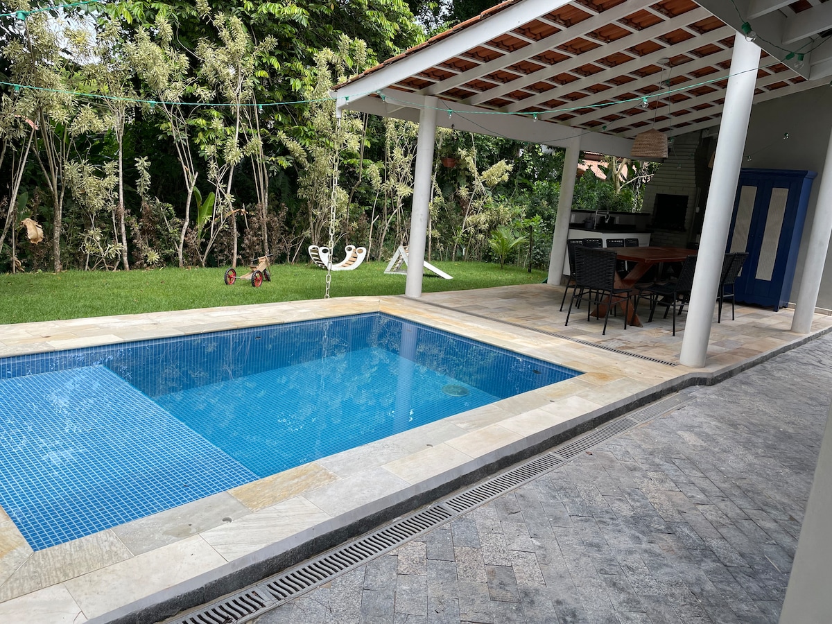 Casa totalmente reformada em 2023, estado de nova, linda e confortável, à 80 m da praia! Com 5 quartos (três suítes), todos com armários e ar condicionado split! Televisão de 62". Com espaço gourmet completo e todos os utensílios de cozinha. Lavanderia com máquina de lavar e secadora. Piscina com hidro. Acesso exclusivo para a praia. Praia muito segura para crianças. Próxima a um rio lindo e com muita natureza. Praia estritamente familiar.