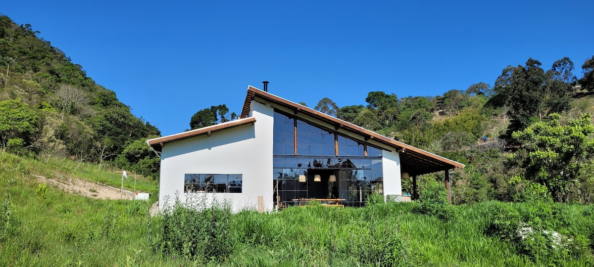 Casa confortável e espaçosa, com vista 360º para a natureza. Varanda ampla integrada ao gramado, ótima para refeições ao ar livre ou relaxar apreciando o pôr do sol. Cozinha completa, incluindo fogão a lenha. Sala com lareira aconchegante. Vistas incríveis da lua e montanhas ao redor. Fácil acesso, perto do centro de Catuçaba, com segurança, privacidade e imersão na natureza. São 4 quartos, sendo 2 suítes e 1 banheiro social.