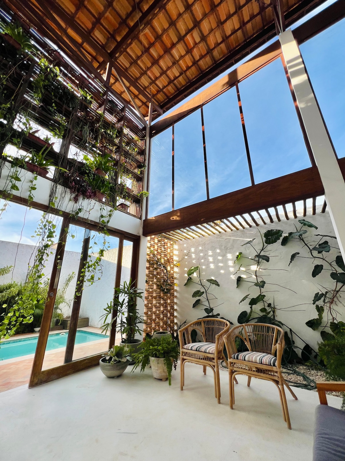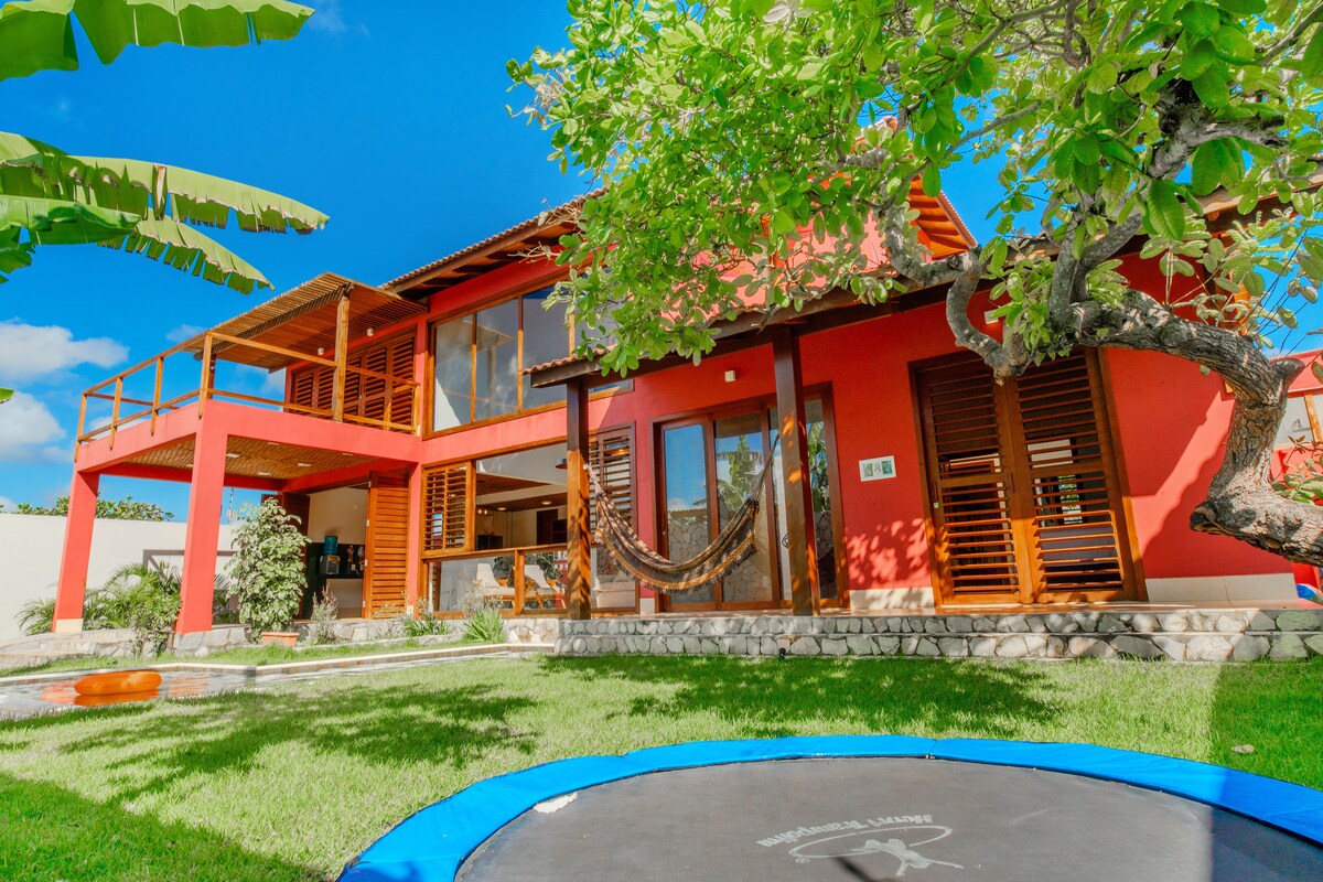 Relaxe nesta casa charmosa e iluminada, a apenas 950 m da melhor praia para kitesurf. São 3 suítes: • Suíte superior com cama king, 2 bicamas, varanda e rede • Suíte térrea com cama queen, vista pro jardim e acesso à piscina • Suíte térrea com mezanino: cama queen, sofá-cama, ar-condicionado, geladeira e jardim com rede Sala ampla, cozinha equipada, piscina privativa e área externa com cama elástica cercada por natureza. Segura, acolhedora e perfeita para quem busca conforto e tranquilidade.