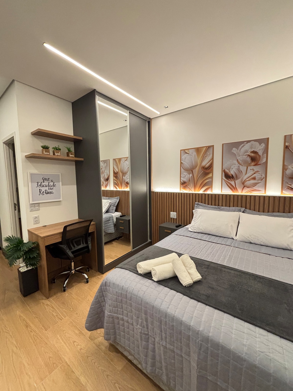 注意:如需使用停車設施,請提前通知。請參照圖片中的入口。 裝飾精美的現代閣樓,可欣賞聖保羅的美麗城市景觀。提供 10 公分厚的枕頭、50 吋電視和陽光明媚的環境。廚房配備優質餐具,包括餐桌和工作台。衣櫃有很好的儲物空間,公寓有空調,全年都很舒適。