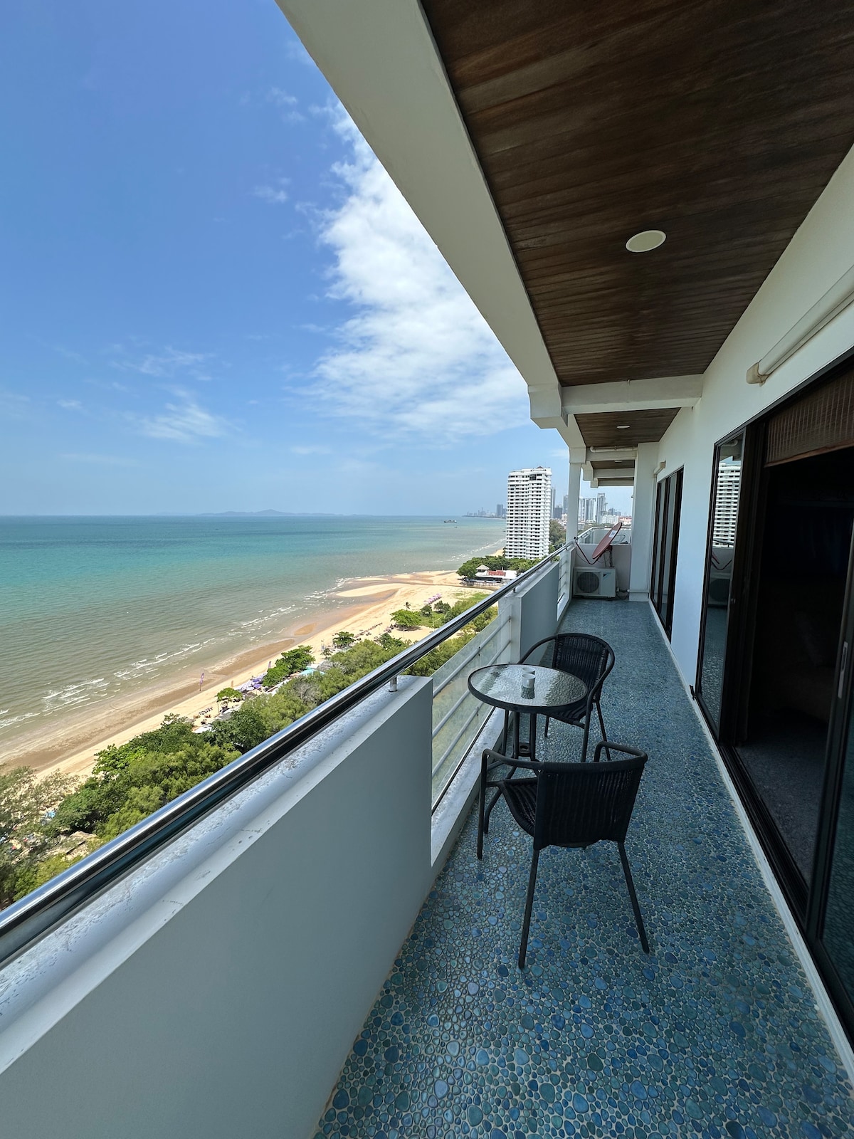 明亮通風的150平方公尺3間臥室海濱複式公寓,配有屋頂泳池、全功能廚房、開放式樓層、Wi-FI、2臺連接到網路的智慧電視。可選擇私人司機/導遊,可提供機場接送服務。在兩個陽臺上欣賞美麗的日落和迷人的景色,從4樓和5樓或從8樓的屋頂泳池直接到海灘,聽到海浪聲。 位於一個安靜的漁村,距離芭塔雅市25分鐘路程。