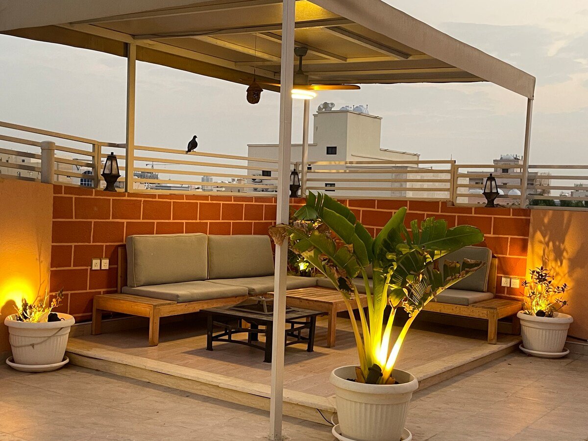 Enjoy a luxurious rooftop stay in a stylish two-bedroom residence featuring a spacious living area, a private outdoor seating area, a fully equipped kitchen, and two clean, comfortable bathrooms. Designed with a modern touch and a calm atmosphere for ultimate relaxation. Ideally located near the Waterfront, Red Sea Mall, and the airport, with easy access to restaurants, cafés, and shopping areas. Perfect for families, couples, and business travelers seeking comfort, privacy, and a prime location