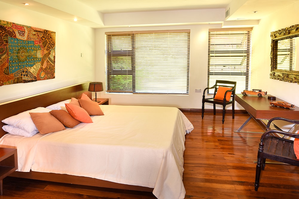 If you value privacy for two, this first-floor apartment is perfect. Relax there away from prying eyes, unless you prefer the poolside or the shade of a coconut tree. Its wooden terrace, set in the tropical garden, faces the pool. Furnished in a contemporary style and bathed in light except during the hottest hours of the day, this apartment is very pleasant. Its orientation and natural ventilation make the atmosphere very comfortable without necessarily using air conditioning.