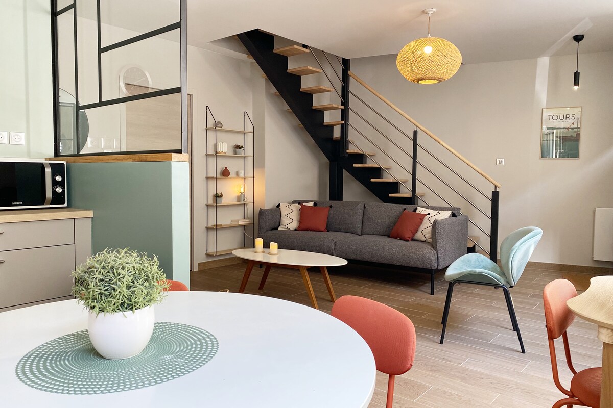 位於一棟安靜的十九世紀小樓中,靠近市中心。 面對羅亞爾河,18號,一樓以非常明亮的氛圍和真實的材料歡迎您 60 平方公尺的空間,天花板高度適中,設備齊全的廚房、高效的 WiFi 和大樓底層的免費停車位,讓您與家人、戀人、朋友或同事一起享受舒適的住宿體驗 享受其優越的地理位置