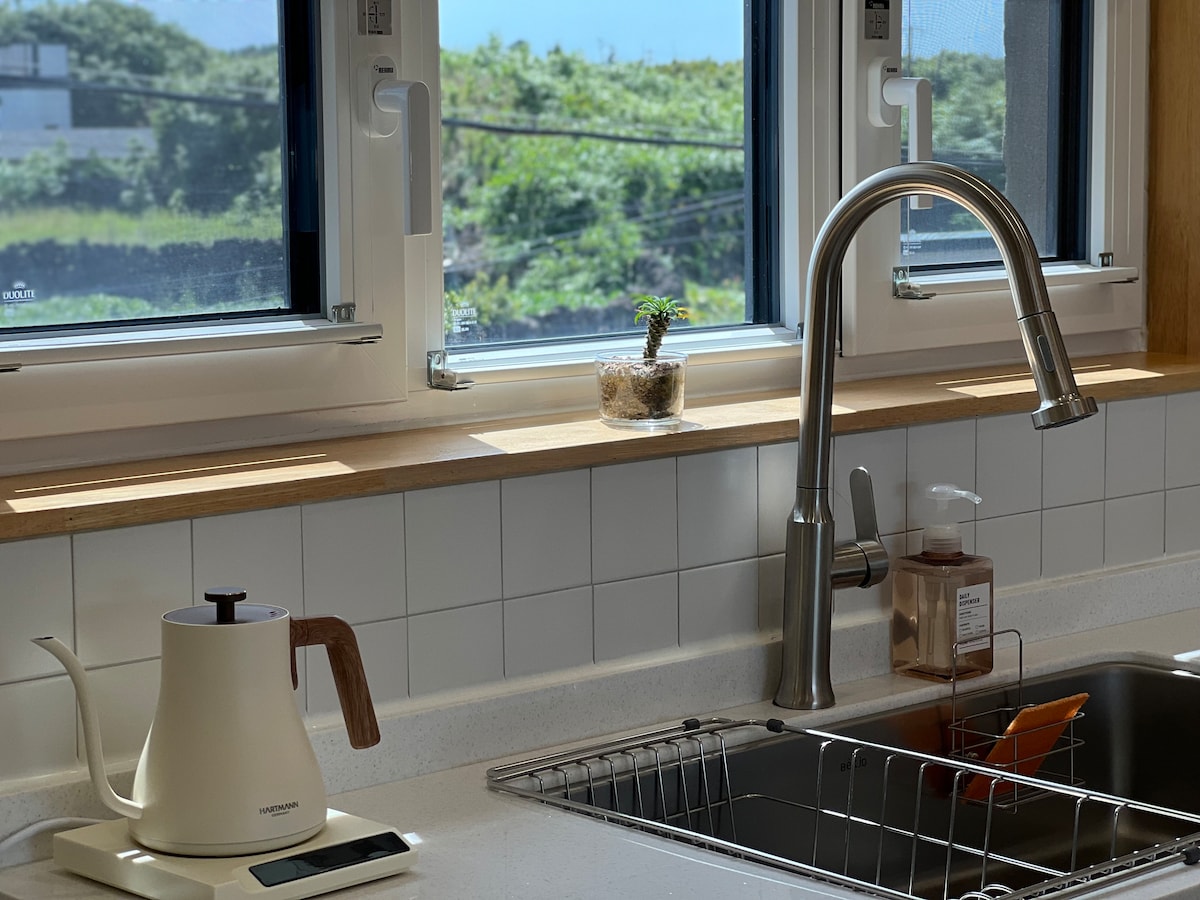 It is located in the east of Jeju Island. It is Haengwon-ri, close to the famous Woljeong Beach. The exterior is surrounded by stone walls. It is a comfortable and comfortable accommodation with modern comfort. It's quiet outside the window and you can see the countryside of Jeju Island. With Jeju Island's unique nature and quietness It's the perfect accommodation to relax alone with friends and lovers. There is a small house and a big house The house you're looking at is a "small house."