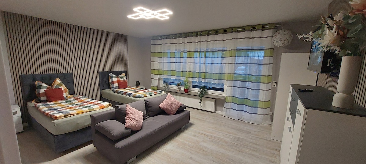 位於頂樓(2樓)的40平方公尺現代公寓,樓上)配有大型開放式廚房、帶雙人床的臥室以及帶淋浴和浴缸的浴室。 客廳內有一張大沙發床,公寓內共有 4 個睡眠空間。房子前面有個停車位。步行僅需 10 分鐘即可抵達 Dietzenbach/Steinberg 火車站,可直達法蘭克福和奧芬巴赫。附近有超市和餐廳。