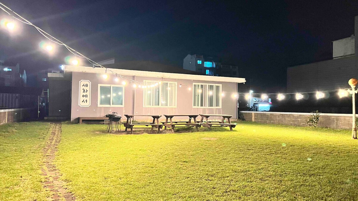 안녕하세요 저희는 세화해변 도보1분거리에 위치한 포구뷰를 가진 아름다운 단독주택입니다~^^ 해변까지 도보 1분 음식점 마트 편의점등 도보 10분내외로 모두 이용하실 수 있으며 모든 배달 가능합니다~^^ 하나로마트 파리바게트 버커킹 다이소 스타벅스등 걸어서 이용하실수 있는게 장점이며 이이들과마당에서 뛰어놀며 바베큐와 불멍을 즐길 수 있는 최적의 장소입니다👍 단 비가 올경우 바베큐 불가이므로 이점 양해 부탁드립니다🙏 오셔서 즐겁게 시간 보내주시고 정리정돈 분리수거 부탁드립니다 감사합니다😊