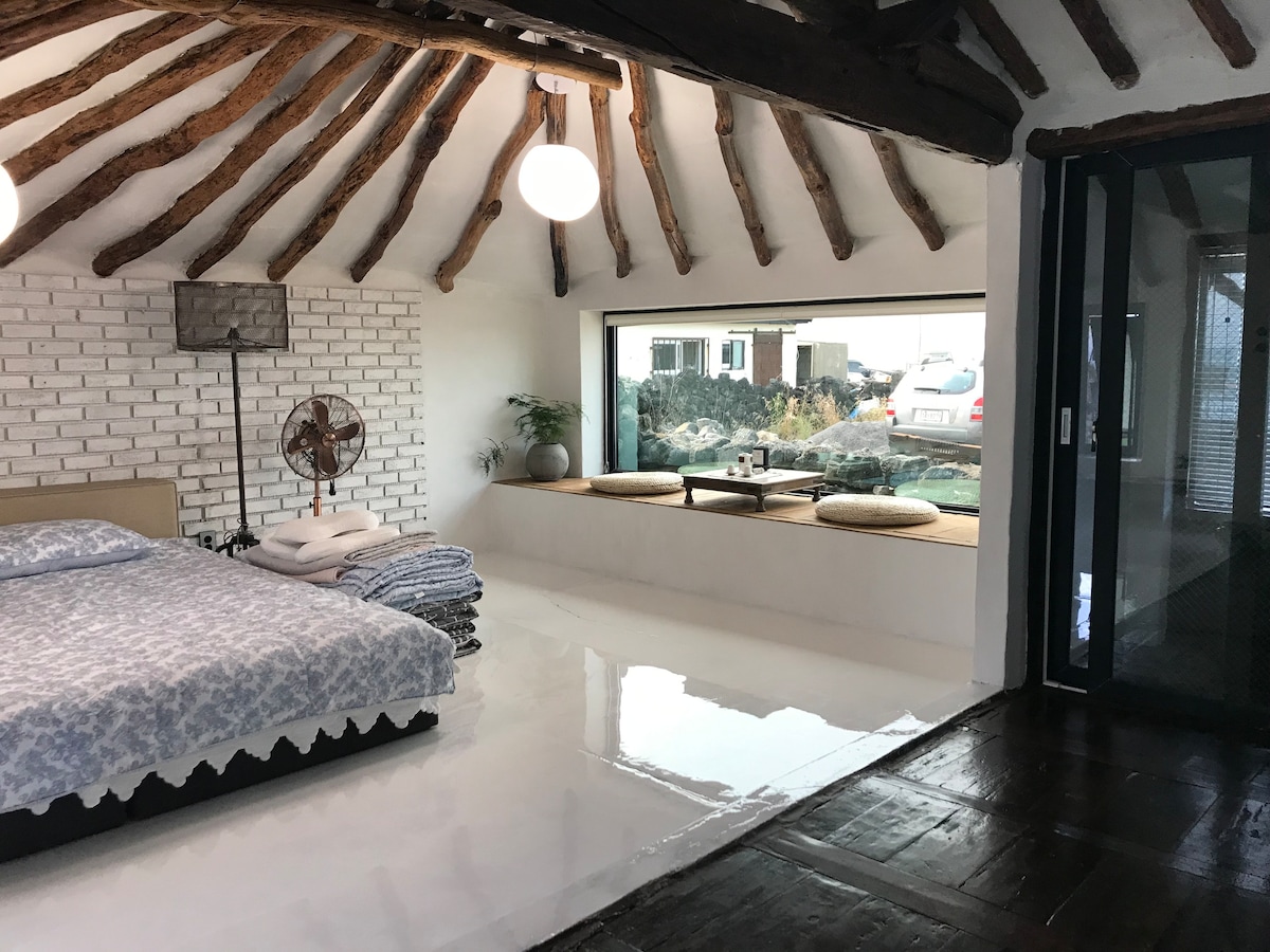 「紅磚屋」是我們專為你打造的環保住宿,名字的意思是「住在山下」,你可以在這裏放鬆身心,聆聽群山的聲音,欣賞群山的景色。 享受高天花板、舒適閣樓和私人露台, 漢拏山景觀和日落。✨ 📍 地理位置優越 •位於Olle Trail ( 9號公路)。 •步行3分鐘即可抵達群山山口。 •開車2分鐘即可抵達主幹道。 🔥 設施 •燒烤、壁爐(篝火)和按摩浴缸。 • 夜間觀星。 💬 我們能說流利的英語!