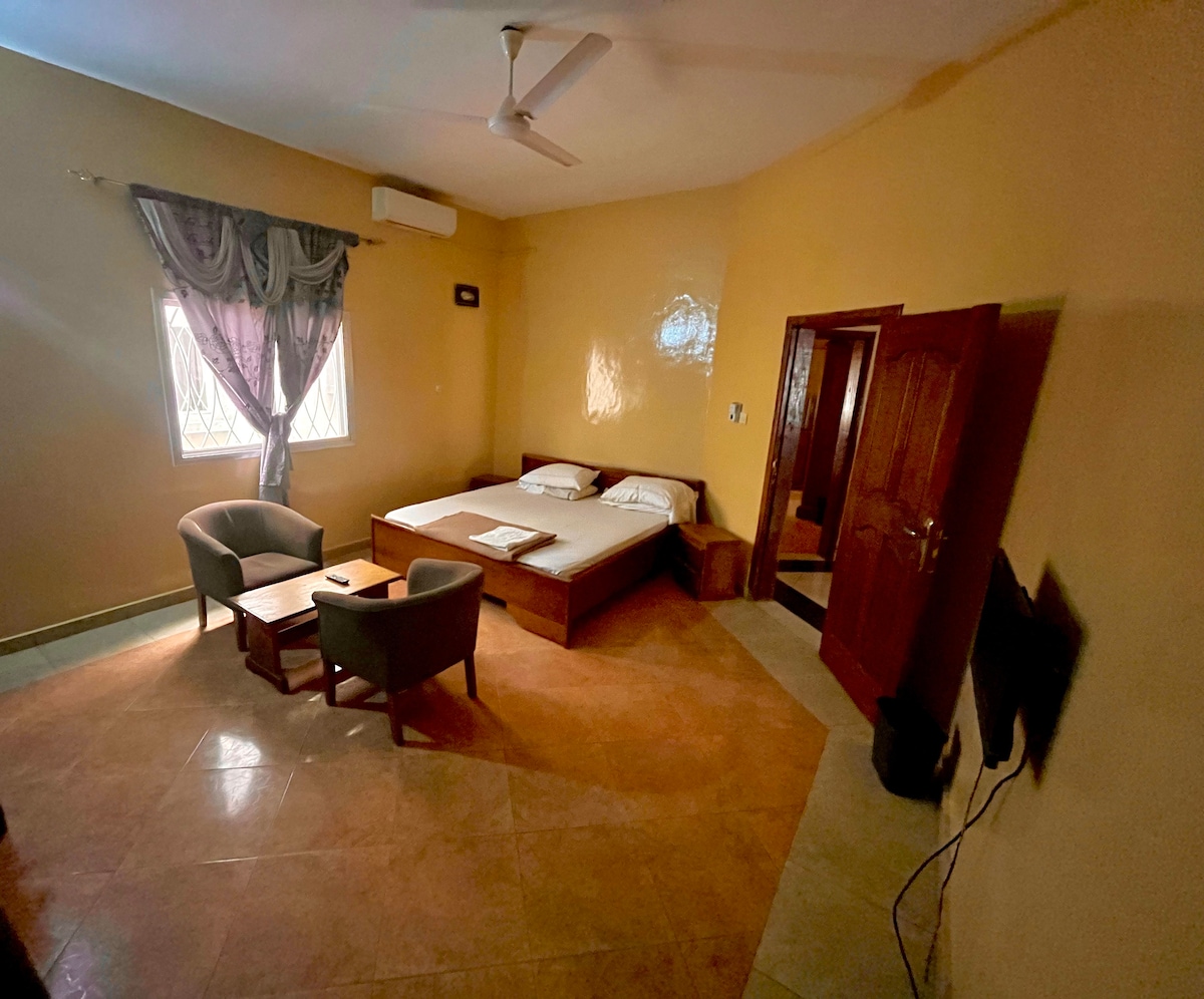 在我們的客棧體驗舒適和便利,距離令人驚嘆的Fajara海灘僅5分鐘步行路程。 寬敞的空調房間,配有1.8米寬雙人牀和附設浴室。 我們的優越位置確保輕鬆使用當地設施: 步行3分鐘即可抵達冰島餐廳,欣賞最好的沙漠。 步行4分鐘即可抵達Standard Chartered、Zenith Bank和GT Bank等主要銀行。 開車8分鐘即可抵達充滿活力的塞內加比亞地區,到處都是餐廳、商店和夜生活等。