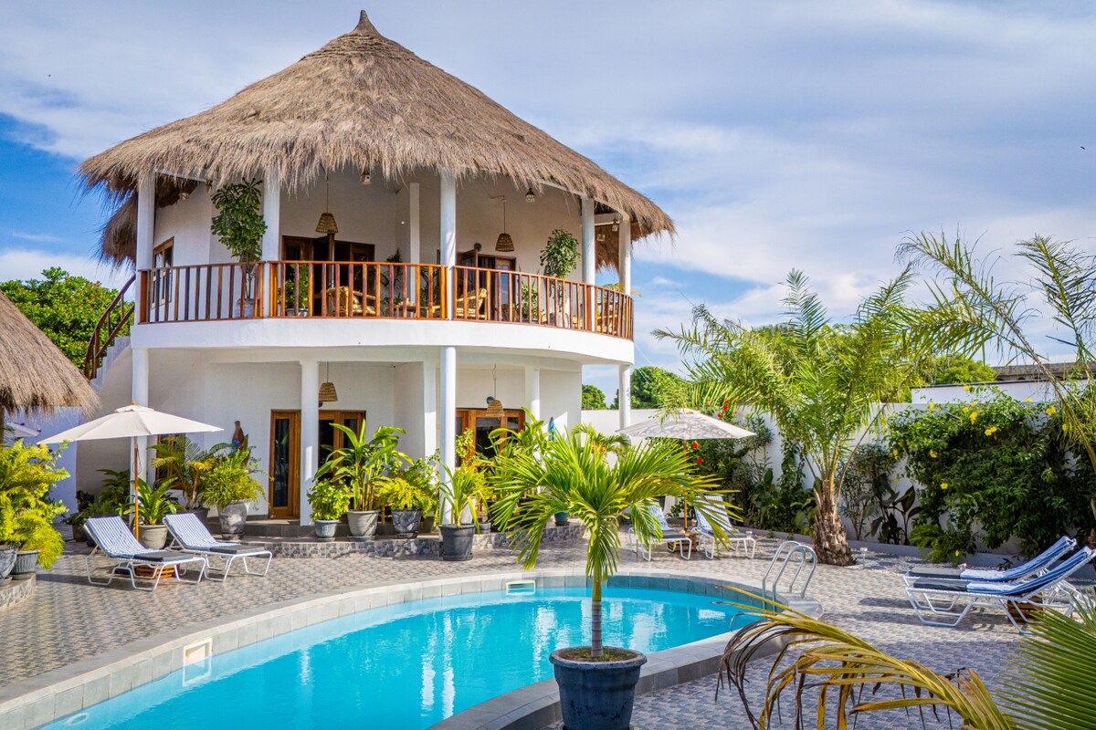 親愛的潛在房客: 2019年,我買了這個地方,當時這片土地上只有3棵樹,現在這是一個美妙的年輕叢林,有17種不同的水果可供享用。 一個很棒的室外廚房和幾個「藝術」建築。 根據要求提供溫水,淋浴用水來自我們自己的鑽井,電力來自我們的太陽能電池板。 我們的拐角處有一間當地酒吧,可以與當地人見面,還有一間酒吧可以放鬆身心。 Mohamed已經是我的朋友6年了。我們一起建造了這個地方。