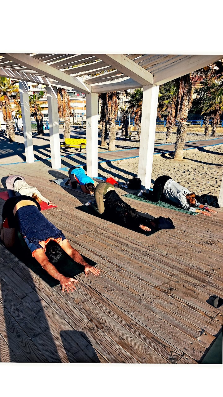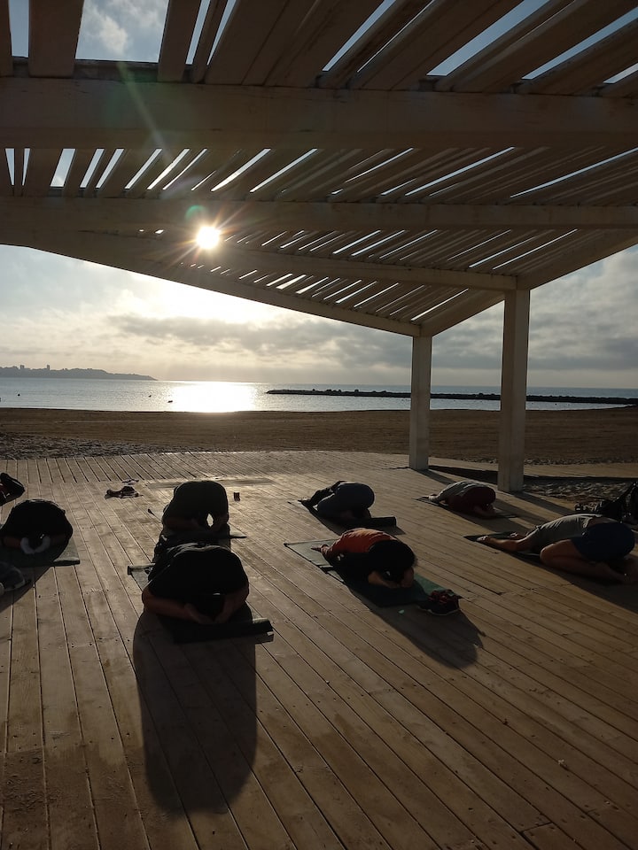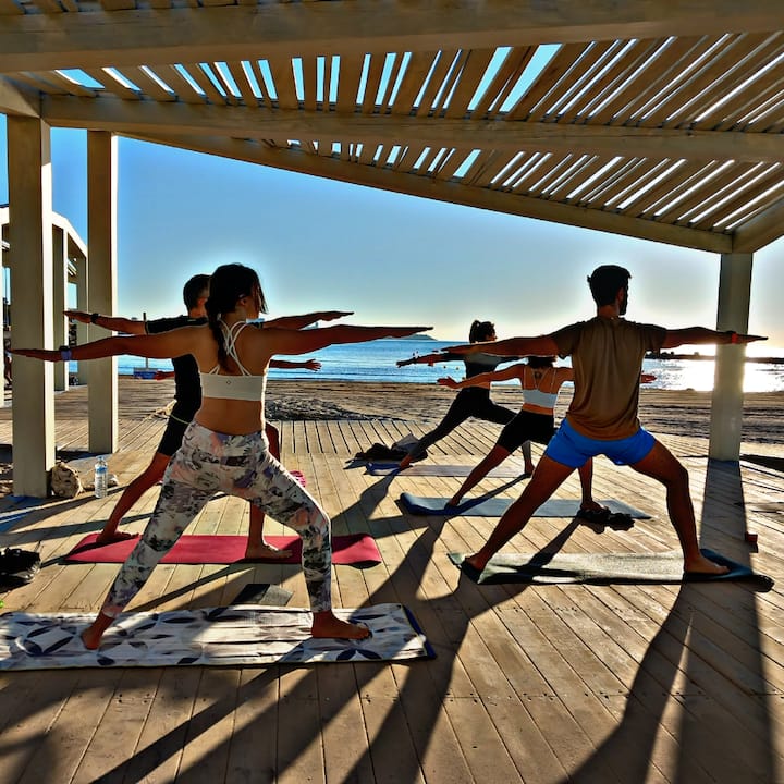 在 El Postiguet 海灘上,伴隨著海景和海浪聲,體驗流瑜伽課程。