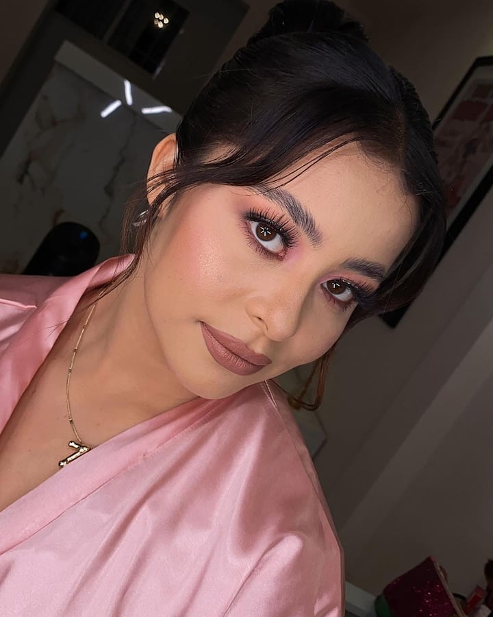 這個方案包括波浪髮型、半收或低馬尾,以及肌膚準備、眉毛和睫毛修飾的化妝產品。