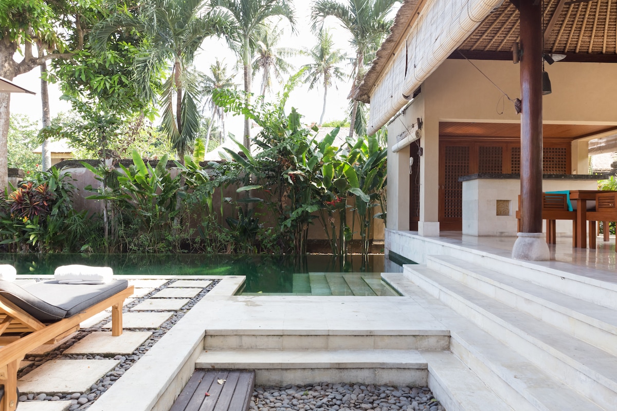 歡迎來到美麗的Anais別墅!這間別墅的室內設計融合了巴厘島熱帶生活風格和波希米亞式的優雅氣息。 這間別墅非常適合家庭或情侶入住。 別墅內採用了和諧的綠松石、藍綠色和中性色調,營造出平靜的海濱氛圍。 盡情享受這座全新翻新的別墅,其設計兼顧舒適與放鬆。 靈感來自島嶼生活的寧靜度假勝地,讓你感受到如同置身世外桃源的感覺。