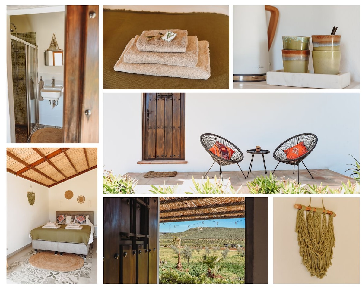 This cozy and pleasant double room is located in the old stable of the Finca and has been fitted with everything you will need to enjoy and relax during your stay at Finca Viva la Vida. The Las Mellizas room has a large double bed with box-spring mattress, a nice modern bathroom and a private terrace in front of the room where you have a beautiful view of the olive groves and the mountains of El Chorro.