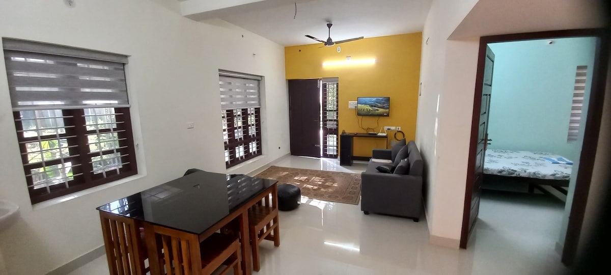 In just Less than 1 km to the iconic Sree Padmanabhaswamy temple, 1 km from Terminal-2, 4–5 km from T-1, 2 km to Central Railway and Bus Station: Experience comfort and convenience in this Pvt 1 BHK apartment on the 1st floor. Guests enjoy an AC attached bedroom (queen size bed that fits 2 adults +extra mattress), Kitchen with Refrigerator & Washing Machine, a Living & Dining space. A private entrance way with steps. Ideal for families and travellers looking for a safe and comfortable stay.