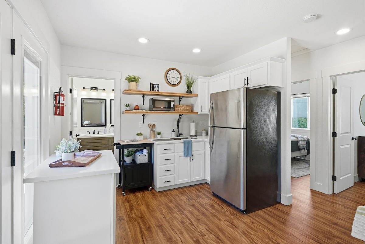 In town but feels like country! Private, safe large parking, and patio area with fire pit. Every comfort considered with large king sized bedrooms. Custom kitchenette with stainless appliances and quartz countertops. Linear gas fireplace, custom concrete hearth, 55" HDTV w/ surround sound, and built in cabinets. Custom oversized tile shower with skylight and tankless hot water. Central Heat & A/C. EV Charger! Easy keypad entrance. Close to I-5 & CA-44. Pet free home. COR Permit SDD-2025-00074