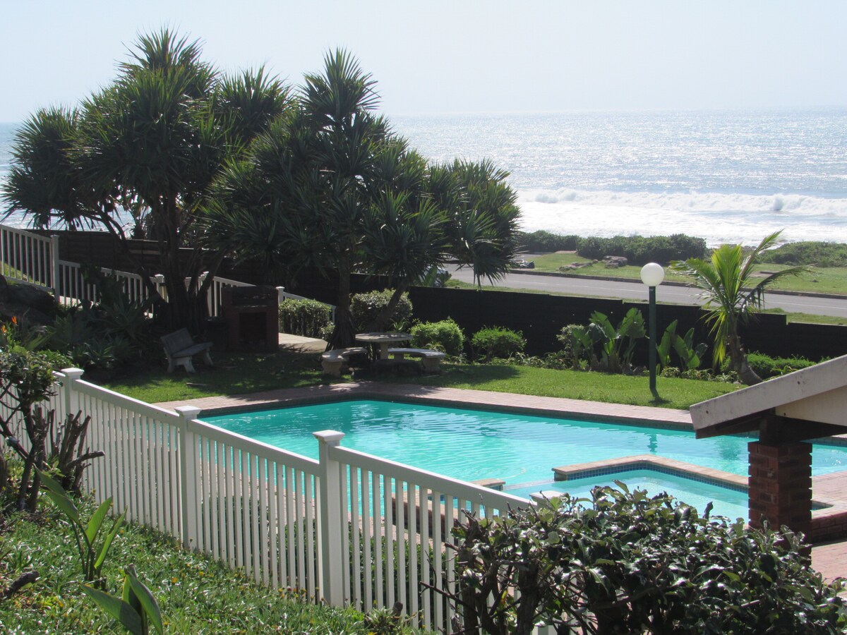 Have a cup of coffee while staring at the ocean from the dining room. A quaint bachelor unit on the doorstep of Uvongo Beach, this unit offers guests a swimming pool, 2 communal braai (bbq) areas and a kids' play area. There is easy access to Uvongo Beach via a gate and pathway that leads directly to the beach. The unit is equipped with a kitchen, a modern bathroom, Netflix, Disney and DStv (log into own accounts), MyFamilyCinema and free wifi. Linen provided. Bring your own towels.