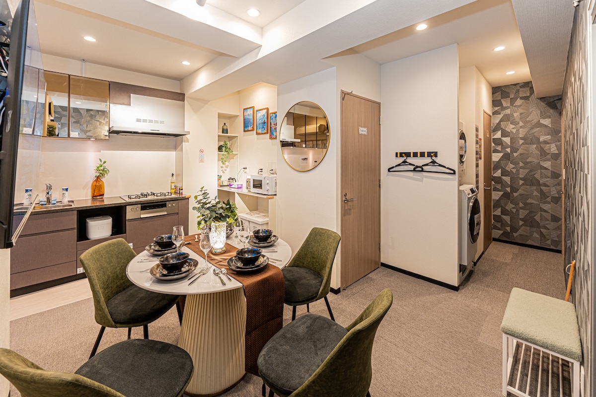 入住這間位處中心地段的房源,全家到哪都方便。 房內配置兩張加大雙人床,適合家人、朋友一同入住。 床距舒適,動線保有獨立空間。最多可住5人。 開放式廚房備有電磁爐、鍋具與碗盤,想吃家常菜、日式簡單料理都不是問題。 吧台連接生活與用餐空間,不論是一杯早晨咖啡,還是一頓晚餐,一切都剛剛好。 洗手台與衛浴獨立設計,幾個人一起住也能保有自己的步調。 提供藍芽音響,在日本的夜晚聽著音樂、泡個熱水澡是旅途中最放鬆的片刻。 房內備有投影機,可輕鬆連接常用的數位串流平台。 洗衣機、空氣清淨機、熨斗與寬敞衣櫃一應俱全,你需要的,我們都準備好了。 空間剛剛好,適合一個人靜靜地在吧台工作,也適合和朋友或家人一起住上幾天。 自在相處,各自舒適。