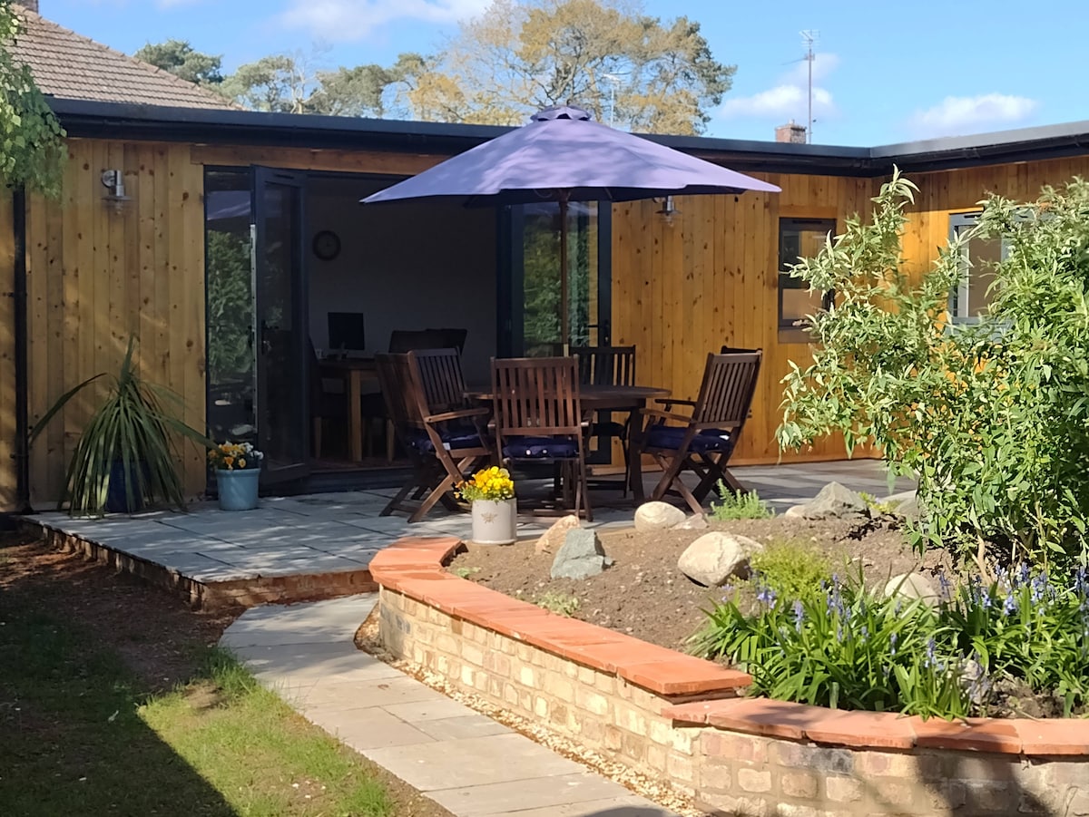 A lovely indendant apartment at the bottom of our garden secluded by trees . the apartment has a nice outside area with patio table and chairs . Inside there is a large open plan kitchen , dinner, lounge with a sofa bed and a well equipped kitchen with double oven , fridge freezer , dishwhaser , whashing machine microwave , toaster, kettle and much more . theres a large smart tv and wifi , dinning table . bedroom with king size bed and built-in wardrobe . bathroom with walk-in shower .