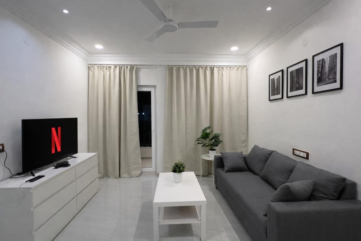 This place is luxurious 1 BHK couple friendly offers modern aesthetics & fully loaded apartment, making it one of the best in Kharadi, Pune. Located just a 5-minute walk from EON IT Park, Barclays, Citi, British Petroleum, & with Magarpatta & Pune International Airpot only 7 km away, it's in a prime spot near cafes, restaurants, shops, public & private transport in Kharadi. Living area features a cozy sofa & Apple TV with OTP channels , Bar unit perfect for relaxing after a day of exploring