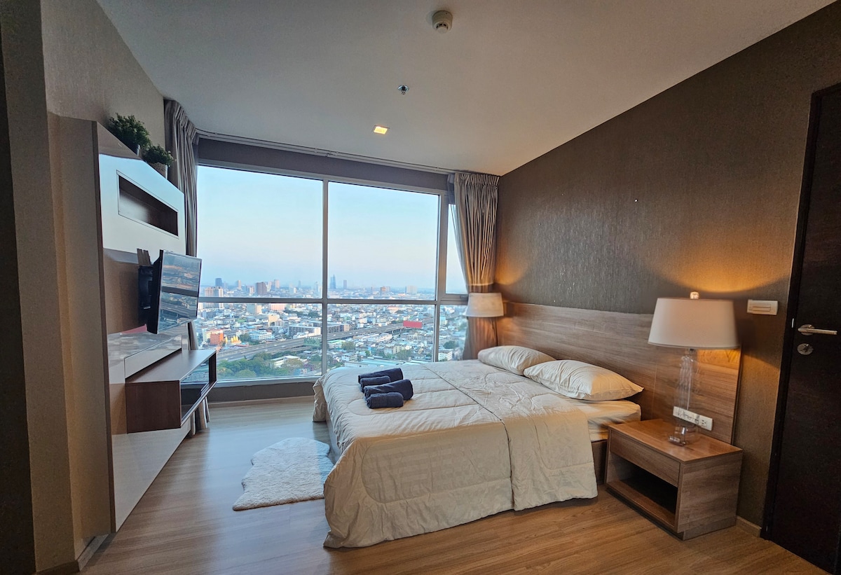 **免費提前入住和延遲退房!** 位於21樓的現代化1居室公寓,可欣賞曼谷天際線的壯麗景色。 位於高度安全的豪華大樓內,室內設施齊全:高速Wi-Fi、智能電視、洗衣機/乾衣機。 輕鬆前往BTS、計程車和公共交通工具。 根據大樓政策,泳池、桑拿和健身設施僅供長期住宿的旅人使用。